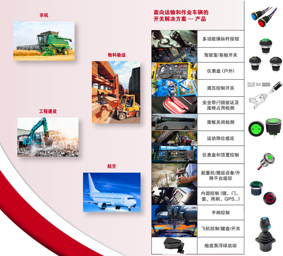 在各行各業中,運輸業是少有的多變且復雜的行業。從用于城市建設、農業耕種和維持基礎設施的重型設備,到搭載我們前往最新旅行目的地的飛機,乃至用于娛樂的個人越野車,這些都離不開品類繁多的開關和解決方案來確保其正常工作。整個行業的共同點之一是它們始終需要通過開關、按鈕和控制桿為車輛提供動力。