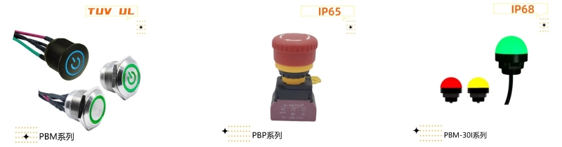 德崧(D-SWITCH)PBM系列金屬按鈕開關、PB系列面板安裝式按動開關, PBP系列大電流急停開關,能夠支持多達百萬次操作, PBM系列單色、多色高亮狀態指示燈, 而且具備 IP67或 IP68密封等級。按鈕和按鈕蓋有多種顏色可供選擇, 而且都具有最佳燈光效果。這些按鈕非常適合 AGV/ AMR 設備使用。