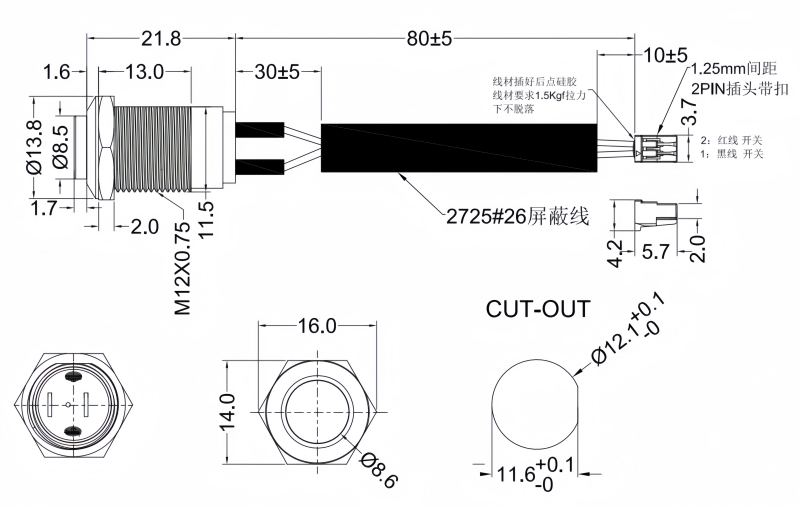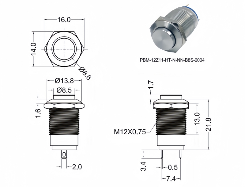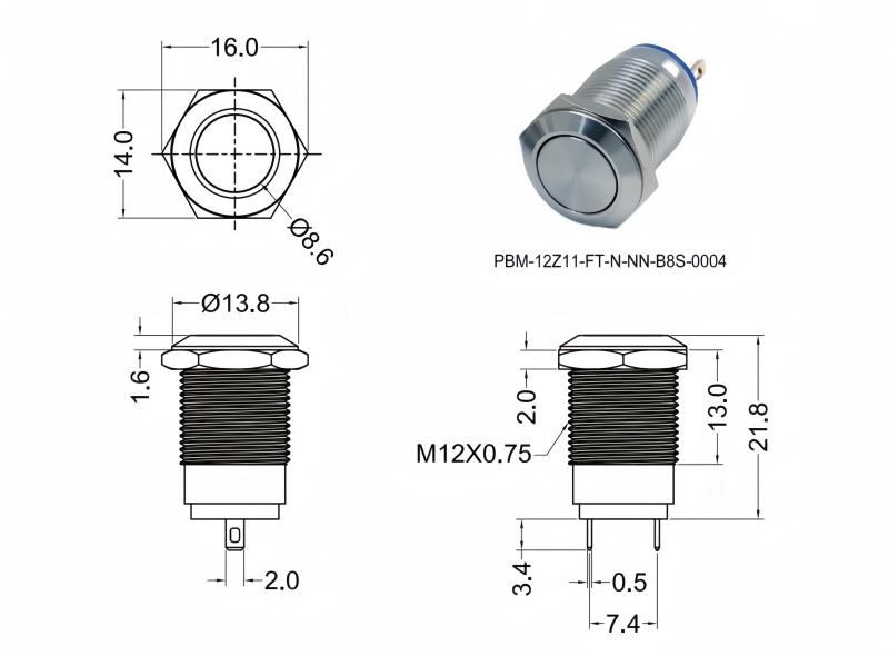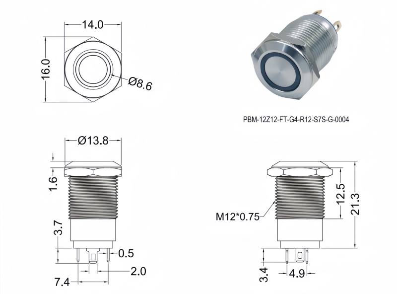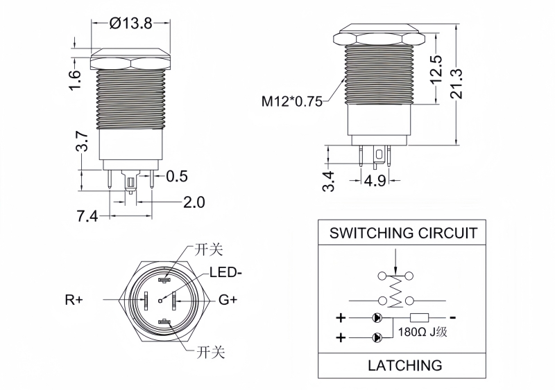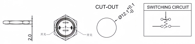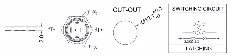 Panel Thickness: Ø12.20mm Function:ON-OFF Latching Contact Rating: 3A 250AV 0.2A 250VAC 0.5A 12VDC Mechanical Life: 100,000 cycles Electrical Life: 50,000 make-and-break cycles at full load Torque: 5~14Nm Travel: About 2.0mm