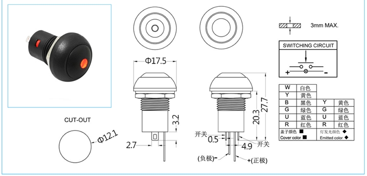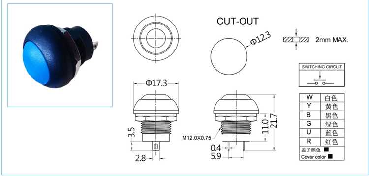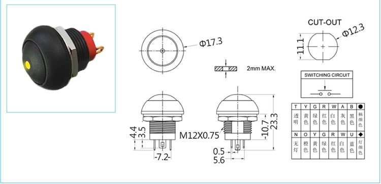 SPECIFICATIONS Panel Thickness: Ø12.30mm Contact Rating: 0.2A 250VAC 0.5A 12VDC Mechanical Life: Momentary 200,000 cycles Self-lock 100,000 cycles Electrical Life: 50,000 cycles make-and-break cycles. Torque: 3~8Nm Travel: About 3.0mm