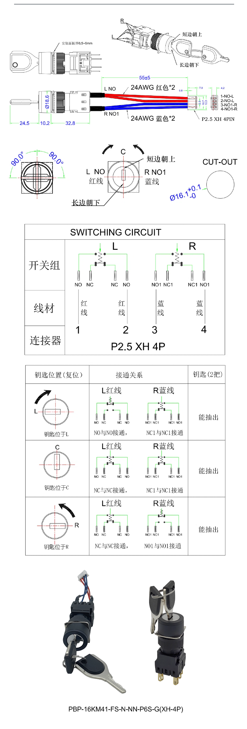 SPECIFICATIONS Panel Thickness: Ø16.20mm Contact Rating: 3A 250VAC 6A 125V AC Mechanical Life: 20,000 cycles Electrical Life: 10,000 cycles make-and-break cycles. Torque: 3~8Nm