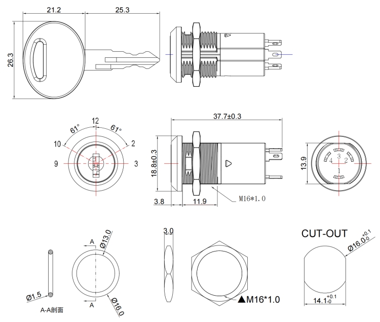 16mm Keylock Switches/S332(PBM-D16KZ11) Series SAFETY/QUALITY APPROVALS : TUV CE/ROHS